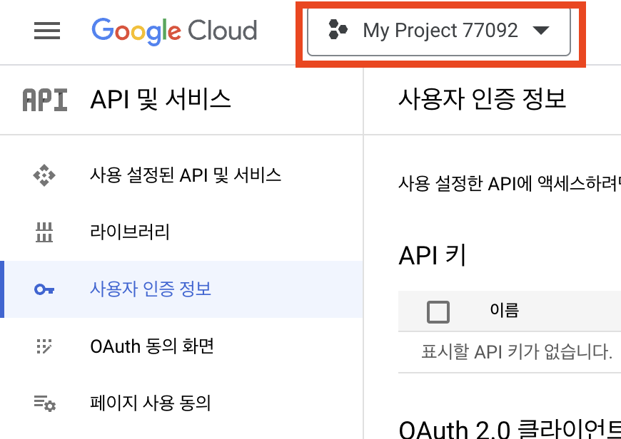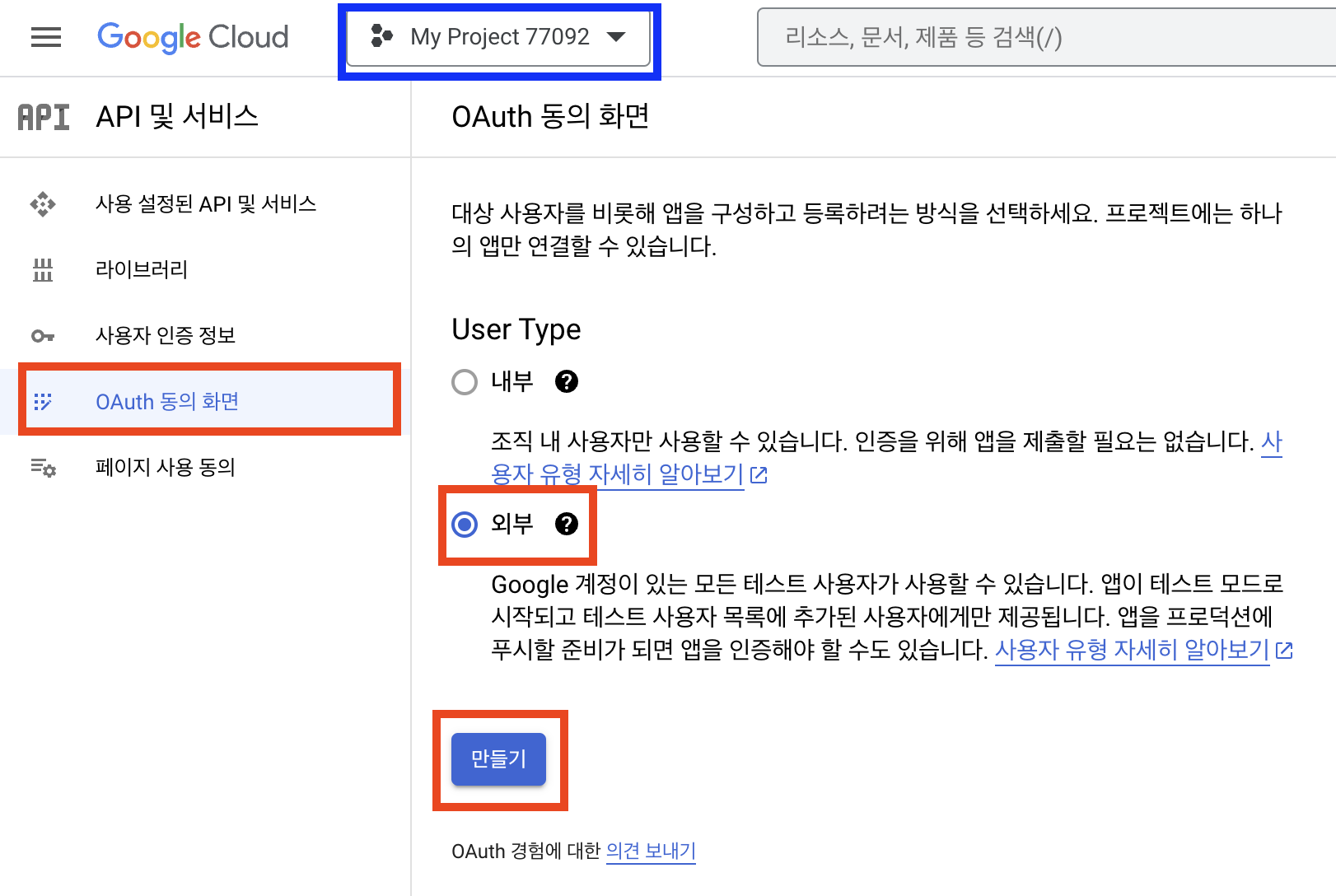 위에 보면 파란색 박스처럼 생성한 프로젝트의 이름이 그대로 뜰 것이다. 그러면, OAuth 동의화면에 들어가서 “외부”를 클릭하고 만들기 버튼을 클릭한다.