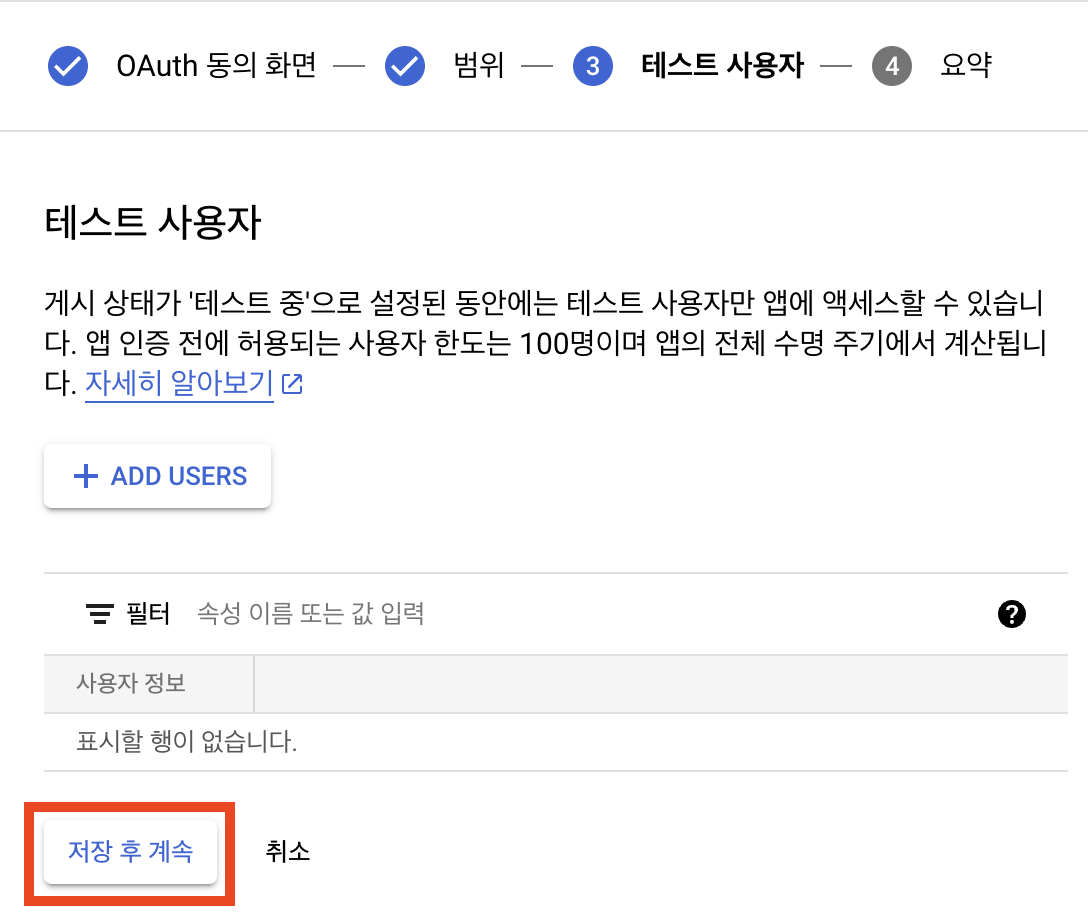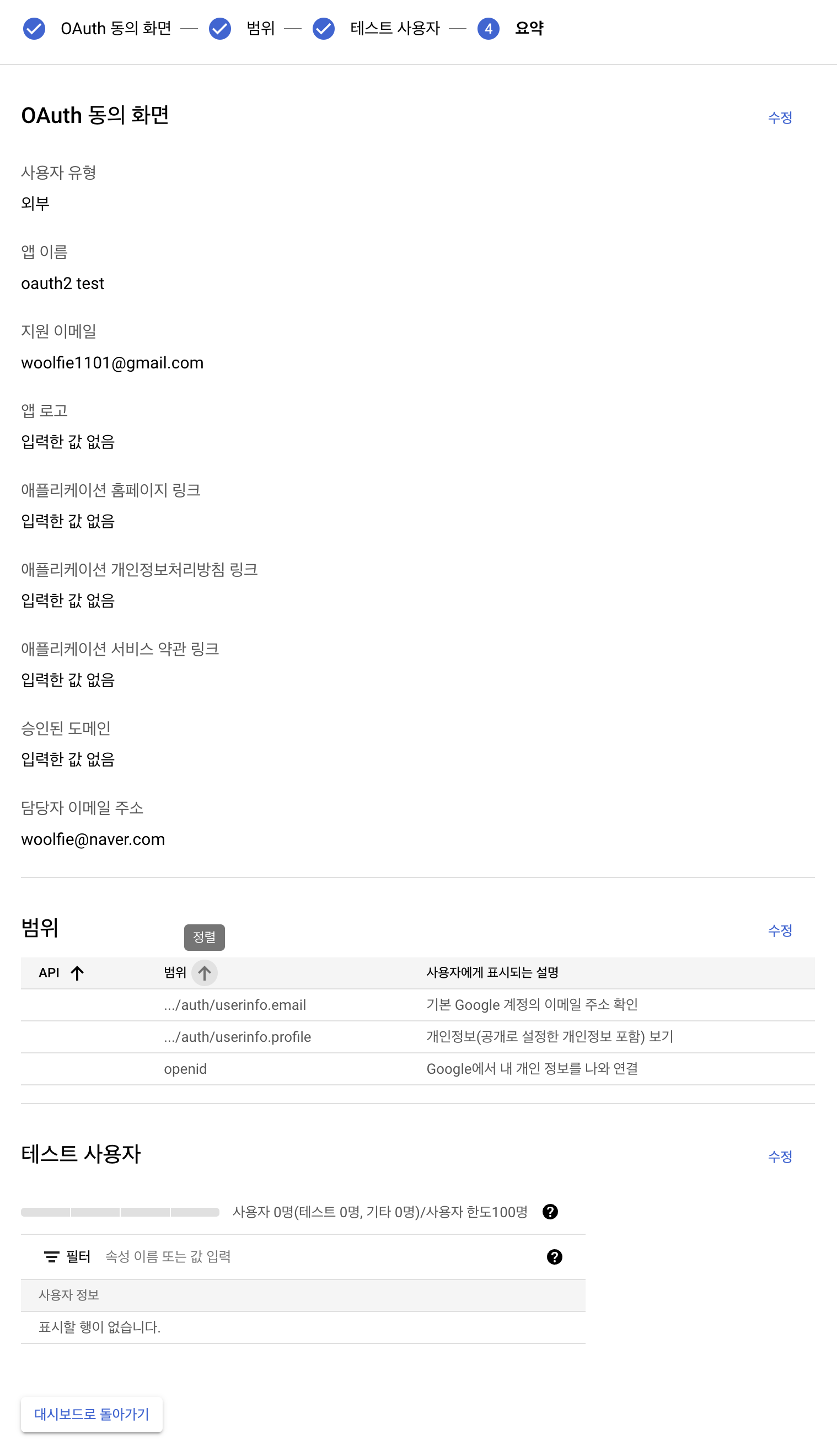 테스트 사용자를 여기서 추가할 수 있다. 하지만, 나는 나 혼자 만들기 때문에 추가없이 하겠다.