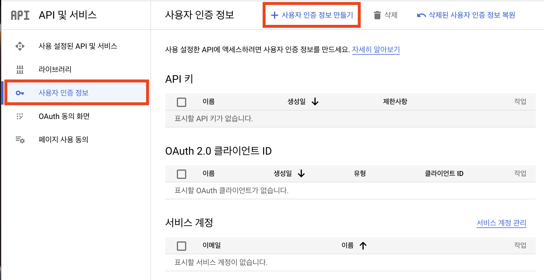 사용자 인증 정보에서 사용자 인증 정보 만들기 를 선택한다.
