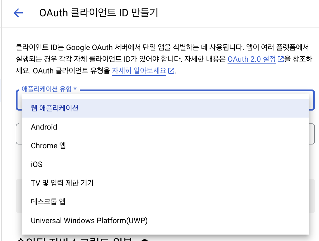 애플리케이션 유형을 선택해주면 되는데 일단 웹 애플리케이션을 선택했다.