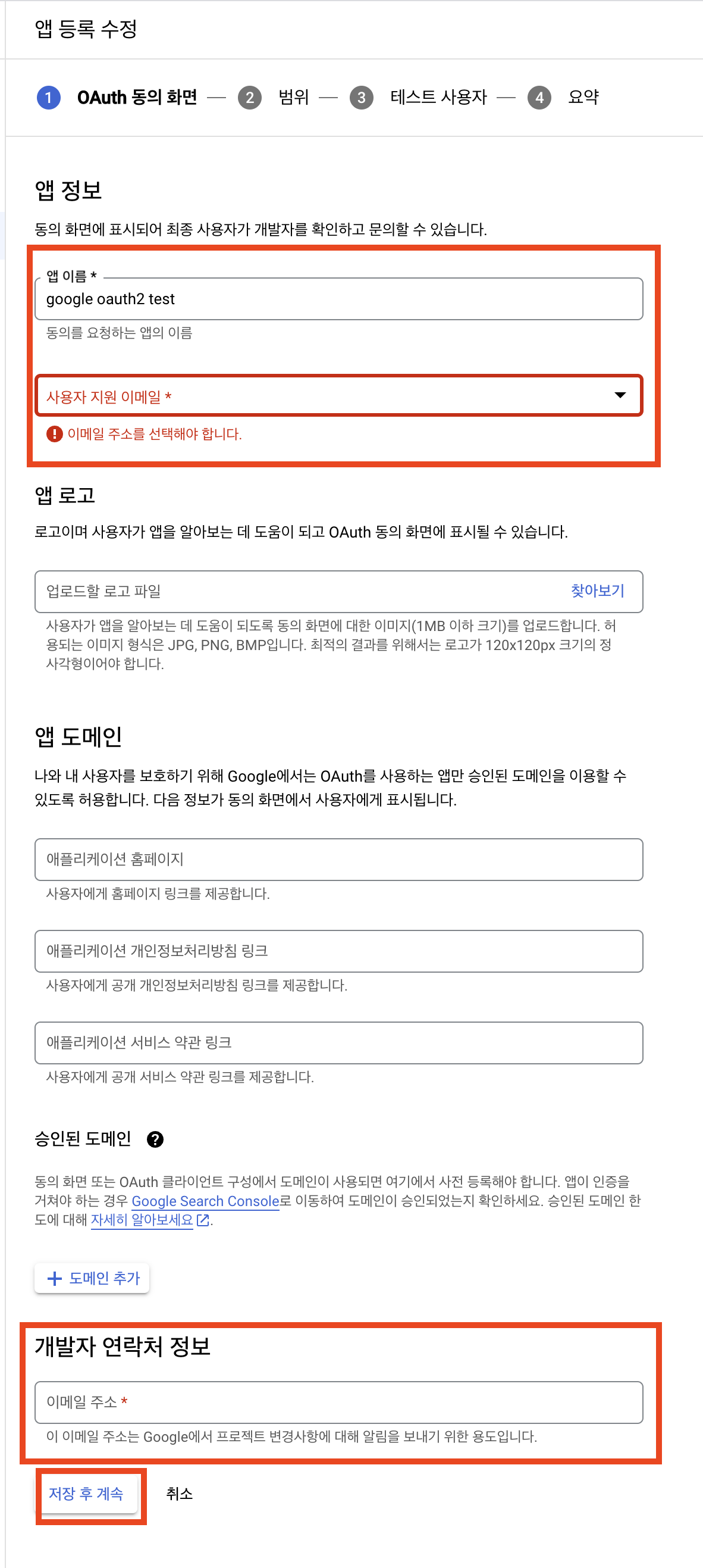 여기서 필수사항은 빨간 박스들이다. 앱 이름, 이메일, 개발자 연락처 정보를 적는다.