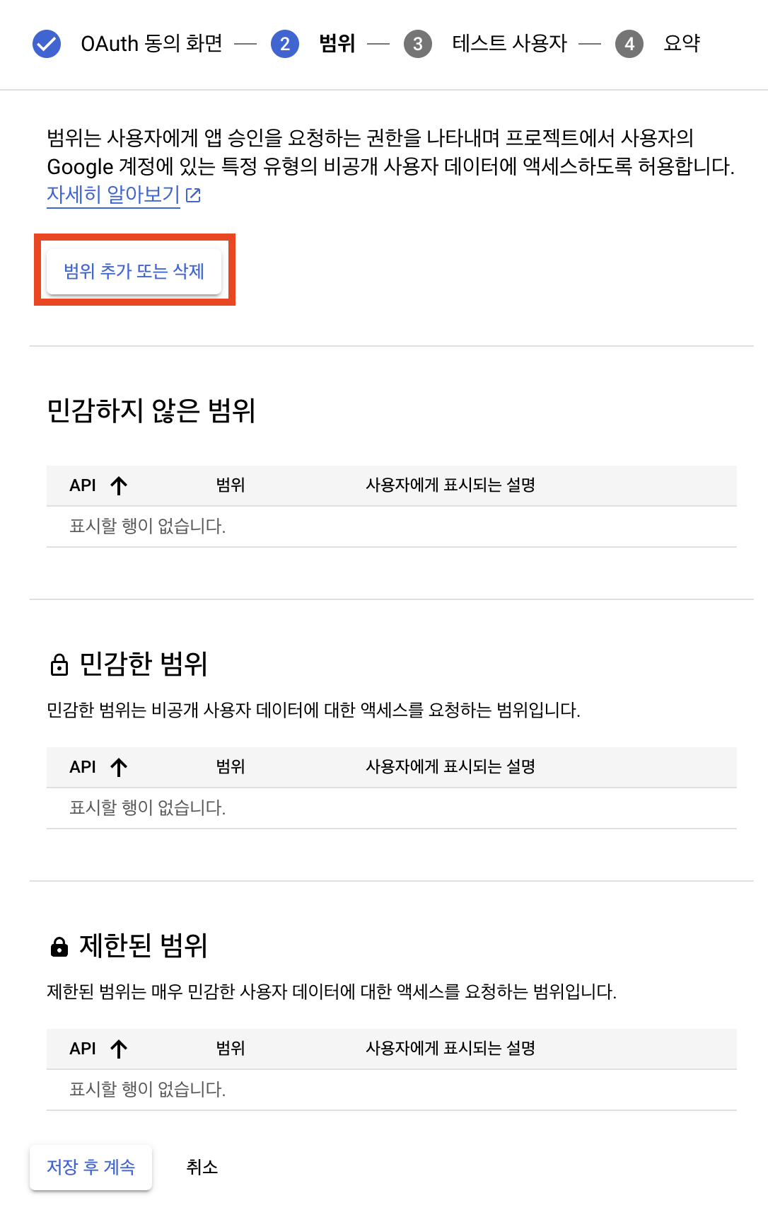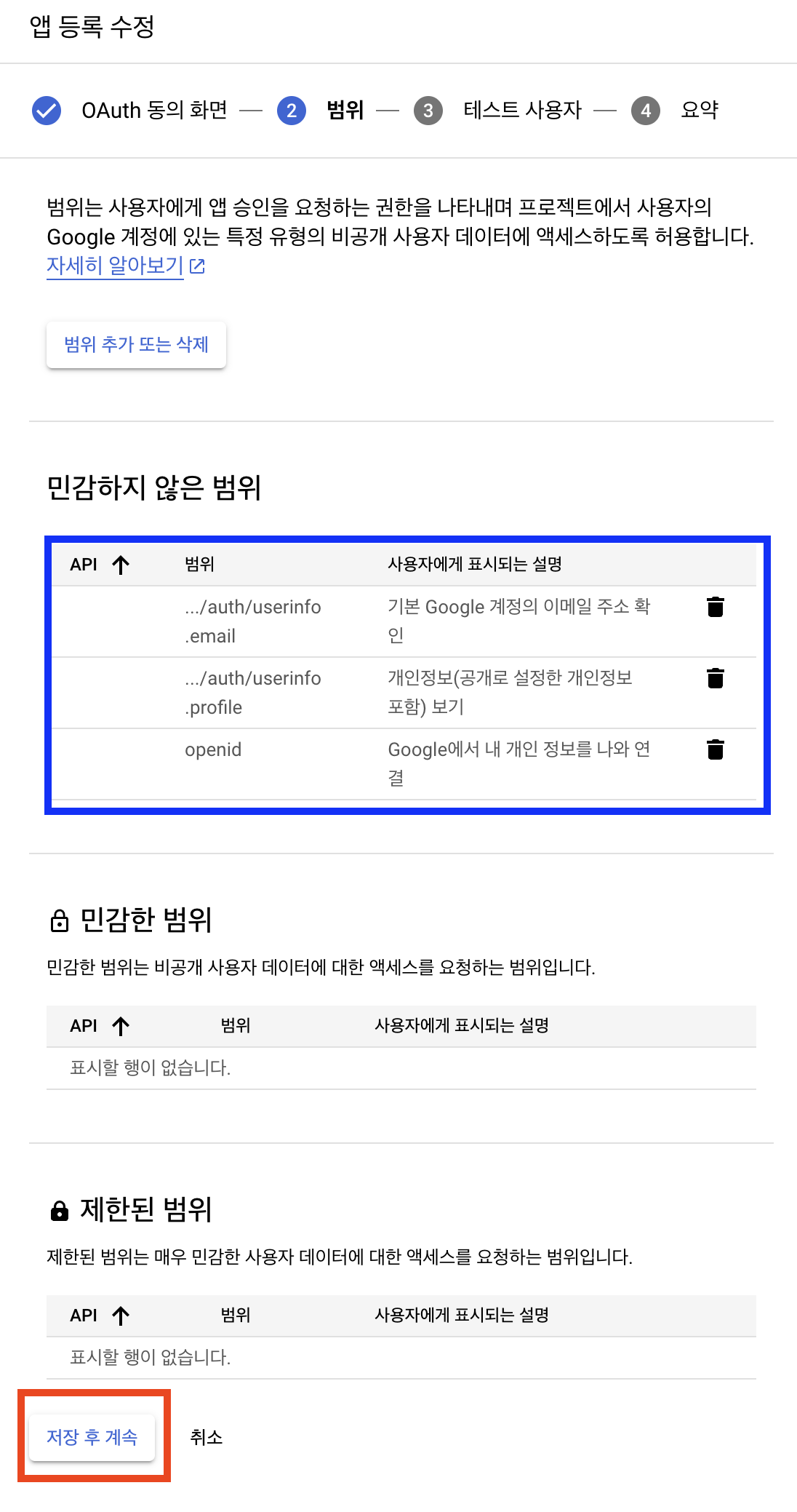 그러면 파란색 박스처럼 내가 선택한 범위들이 뜰 것이다. 저장 후 계속을 누르자.
